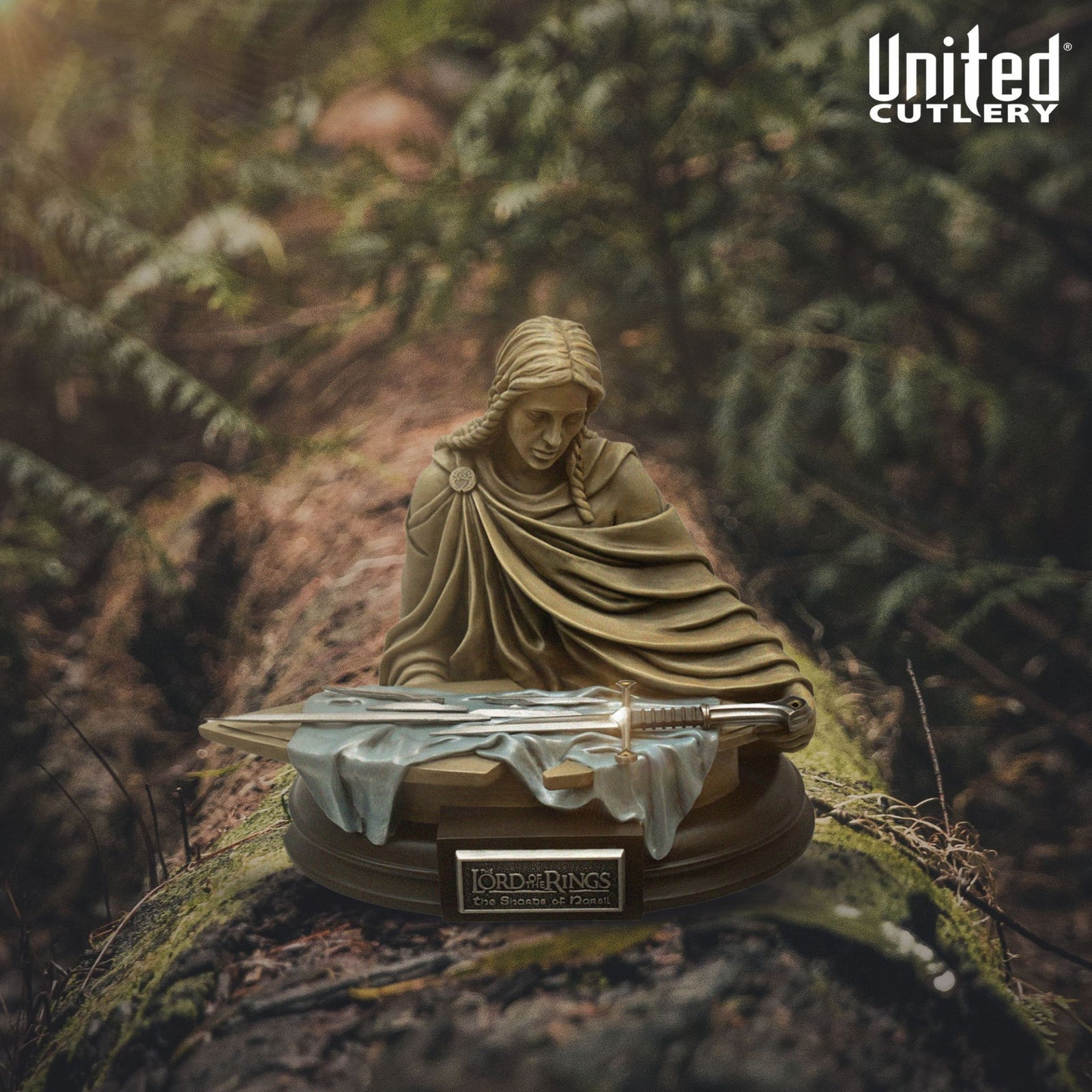 - Estatua de Poliresina Fundida en Frío: Esta exquisita presentación incluye una estatua pintada a mano de una princesa élfica que sostiene un escudo donde reposan los fragmentos de Narsil. Cada detalle ha sido cuidadosamente diseñado para capturar la esencia de esta mítica escena.