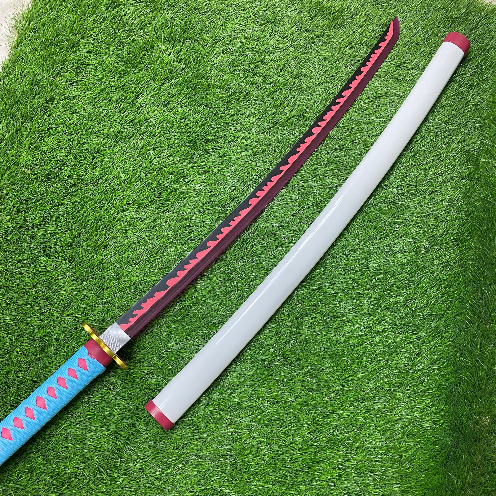 La hoja de acero está curvada y flexible, fiel a la distintiva espada de Mitsuri, mientras que las luces LED integradas iluminan la hoja, potenciando su presencia y destacando los detalles incluso en la oscuridad. El mango encordado reproduce los colores vibrantes y la delicadeza que caracterizan a Mitsuri, proporcionando un agarre cómodo y visualmente impactante. La vaina, diseñada a juego, protege la katana y permite exhibirla con estilo y elegancia.