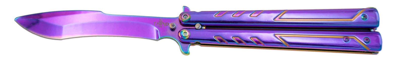 Navaja de abanico, con hoja de acero bañada en titanio magenta, mango de acero inoxidable bañado en titanio magenta.