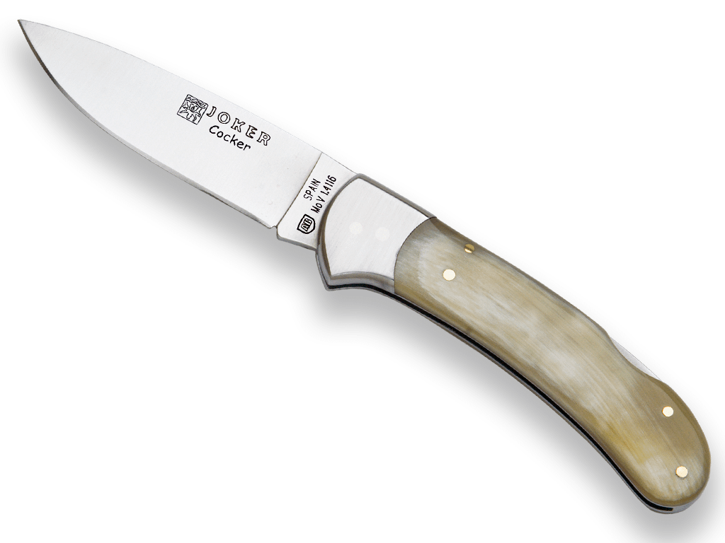 NAVAJA DE CAZA JOKER COCKER CON PUÑO EN ASTA DE TORO VIROLA INOX. Y HOJA DE 9 CM NA47