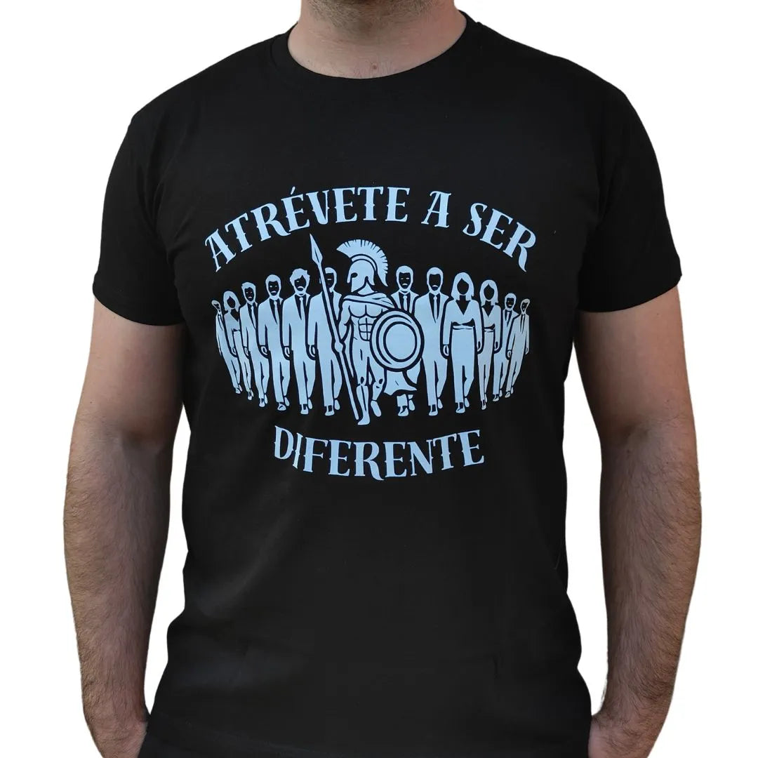 • Estampado: Dibujo de un guerrero espartano frente a una multitud de figuras idénticas y el texto "Atrévete a Ser Diferente"