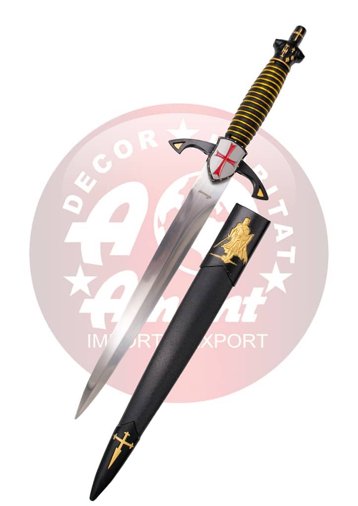 Daga Templaria S0300, el pomo está acabado en níquel y el mango en plástico negro, la guarda acabada en níquel con un escudo templario. El tamaño total es de 40 cm con hoja de acero. La vaina está acabada en plástico negro con una cruz en rojo con los detalles metálicos en níquel. Ref. S0300
