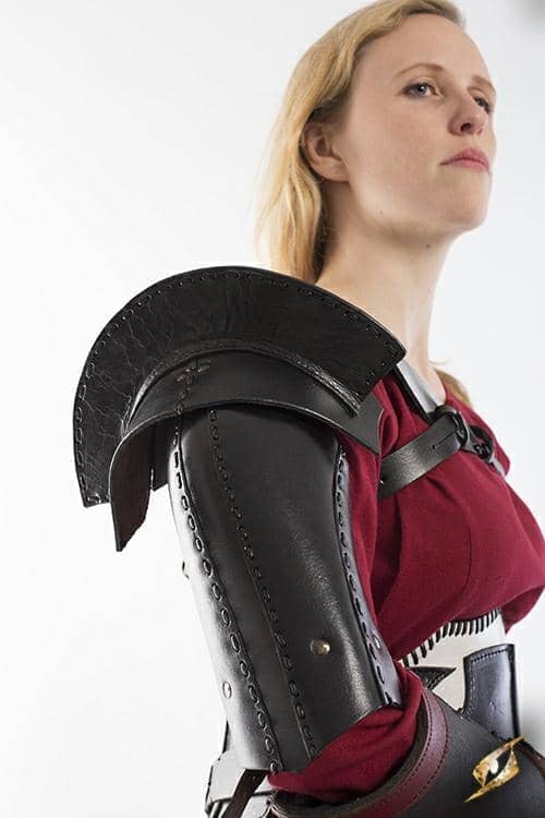 Epic Armoury's Shoulder Armour es una pieza de armadura bellamente elaborada con protección para el hombro y la parte superior del brazo. Hecha de cuero de grano completo curtido vegetal, esta armadura cuenta con un caldero y un rompe espadas diseñado para desviar los golpes de la cabeza. Usando placas superpuestas y ajustadas a la forma para agregar fuerza adicional al cuero, puede esperar usar este protector de hombro durante mucho tiempo con un cuidado regular del cuero. El protector de la parte superior del brazo está adornado con cordones de cuero aplanados y remaches tonificados.