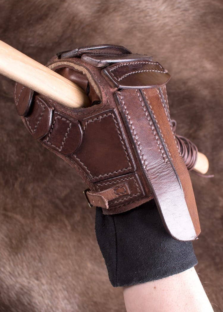 El material robusto y la muy buena mano de obra reducen el riesgo de lesiones en la mano de la espada. El dorso de la mano está protegido por escamas de cuero de 5 mm de grosor, dos capas de cuero más suave y un acolchado interior.