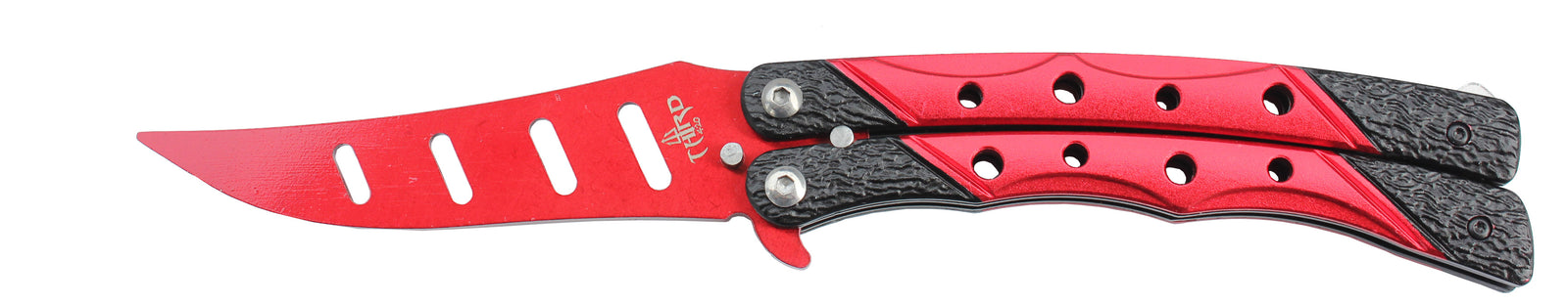 Navaja de abanico de práctica Third K2807RD hoja de acero 420 roja de 12.4 cm, mango de aluminio negro y rojo con agujeros. Ref. K2807RD