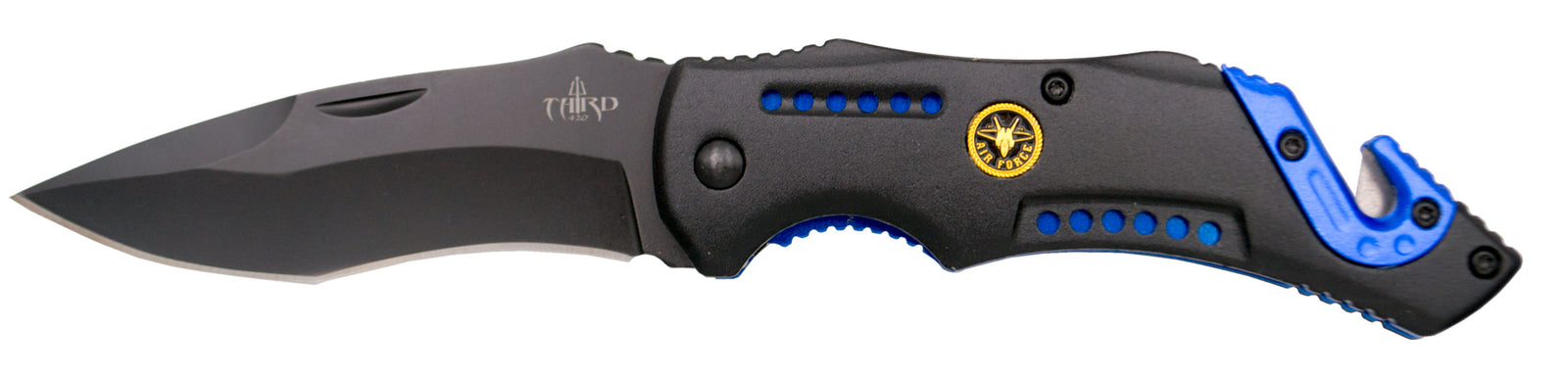 Navaja Táctica Third modelo N81A AIR FORCES hoja de acero 420 acabado negro de 8,7 cm, mango de Aluminio negro con los forros en azul con rompecinturones. Ref. N81A