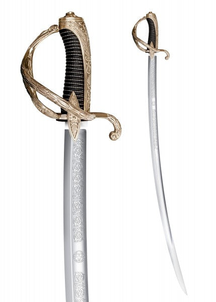 Esta réplica fiel del sable de oficial francés de 1815 presenta una hoja altamente pulida y de grado de combate hecha de acero al carbono 1055, un mango envuelto en cuero con alambre de bobinado combinado con una vaina igualmente pulida de acero inoxidable y una impresionante canasta de Latón macizo lujosamente decorado con tres puntales.