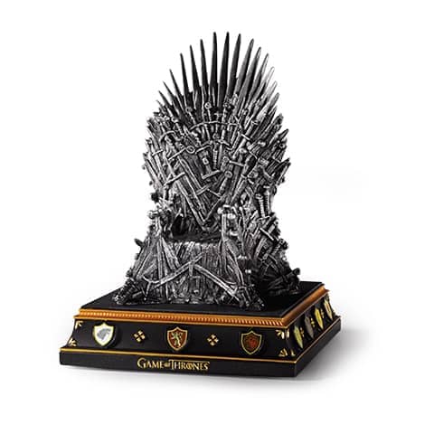 El Trono de Hierro es el punto central del poder real en los Siete Reinos de Westeros. Se encuentra en la sala de Audiencia de la Fortaleza Roja, y fue forjado a partir de las espadas de los enemigos conquistados por Aegon Targaryen en su invasión de Westeros hace tres siglos. Este trono, hecho en resina y pintado a mano, mide aproximadamente 19 cm de altura y 12 cm de ancho.
