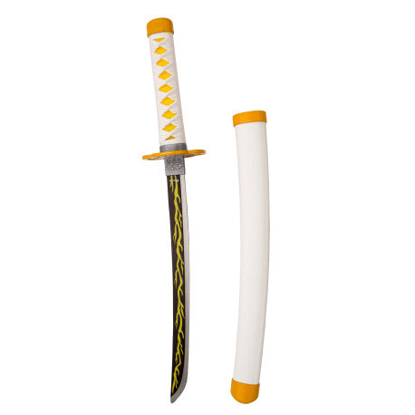 La katana es un arma tradicional japonesa que se ha utilizado desde tiempos antiguos por los samuráis. En la serie de anime Demon Slayer, las armas de los personajes principales son espadas especiales que tienen la capacidad de matar demonios. Agatsuma Zenitsu, uno de los personajes principales, utiliza una katana amarilla que se parece a la mini katana de Agatsuma Zenitsu de Kimetsu no Yaiba Demon Slayer S0281.