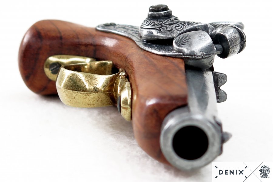 Esta es una réplica muy fiel de esa deringer, fabricada en España por Denix en madera y metal de primera calidad y con todo lujo de detalles.