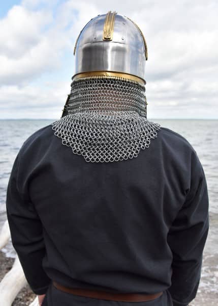 El casco tiene aplicaciones de latón decorativas con grabados y tiene una cadena bruneln de anillos galvanizados.