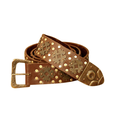 Este cinturón largo está hecho de cuero grueso de calidad. Presenta detalles en latón envejecido y pulido en la hebilla y punta del cinturón. Aproximadamente 178 cm de largo.