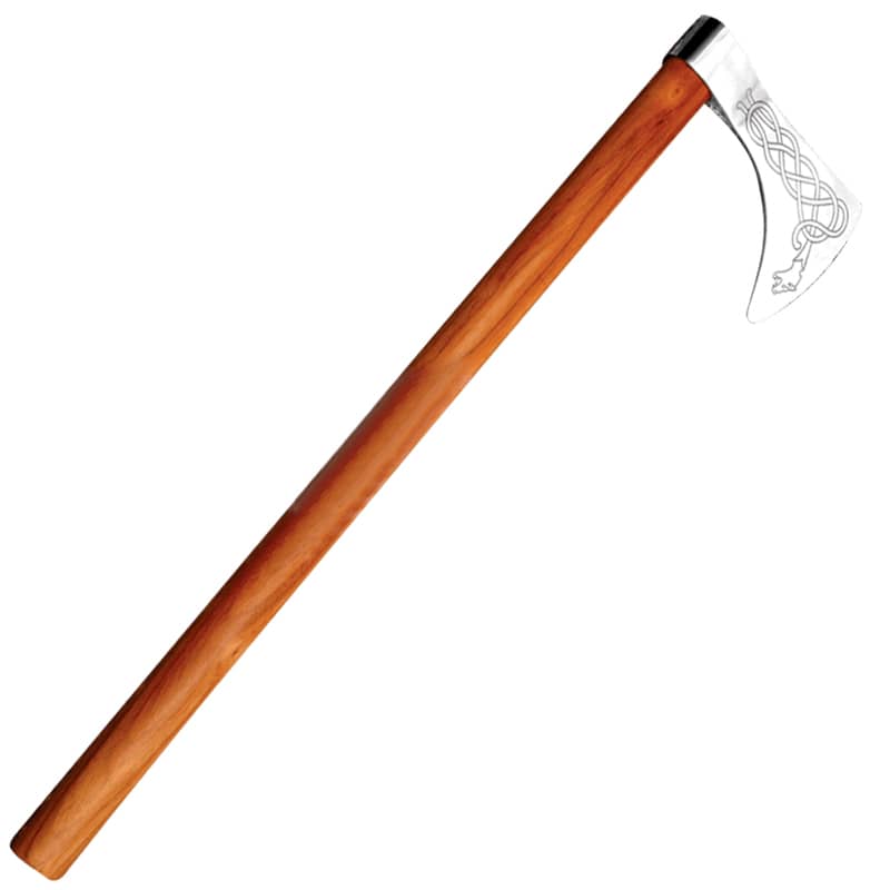 Nuestra réplica muestra un elaborado diseño de nudo de dragón vikingo. Tiene el tamaño perfecto para llevar en la mano junto con un escudo en un combate. La cabeza decorada es de acero templado y el mango es de una madera resistente.