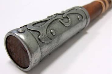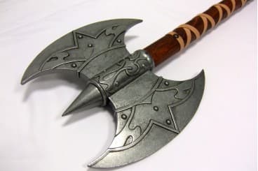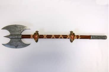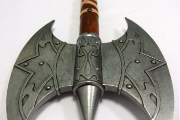 Hacha decorativa vikinga con cabeza de doble filo y astil de madera con bonito trenzado de cuero. Pieza de decoración, no tiene filo. Tamaño 71 cm. Peso 1380 gr. Fabricada en metal y madera. Fabricada en España por Denix.