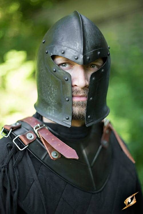 Asegure la Barbuta ajustando la correa de cuero debajo de la barbilla, manteniendo el casco en su lugar. Hecho de acero dulce de 1 mm de grosor y correas y accesorios de cuero de grano superior, esta pieza de armadura está construida para resistir el abuso de un LARP o una recreación con el cuidado habitual de la armadura de cuero y metal.