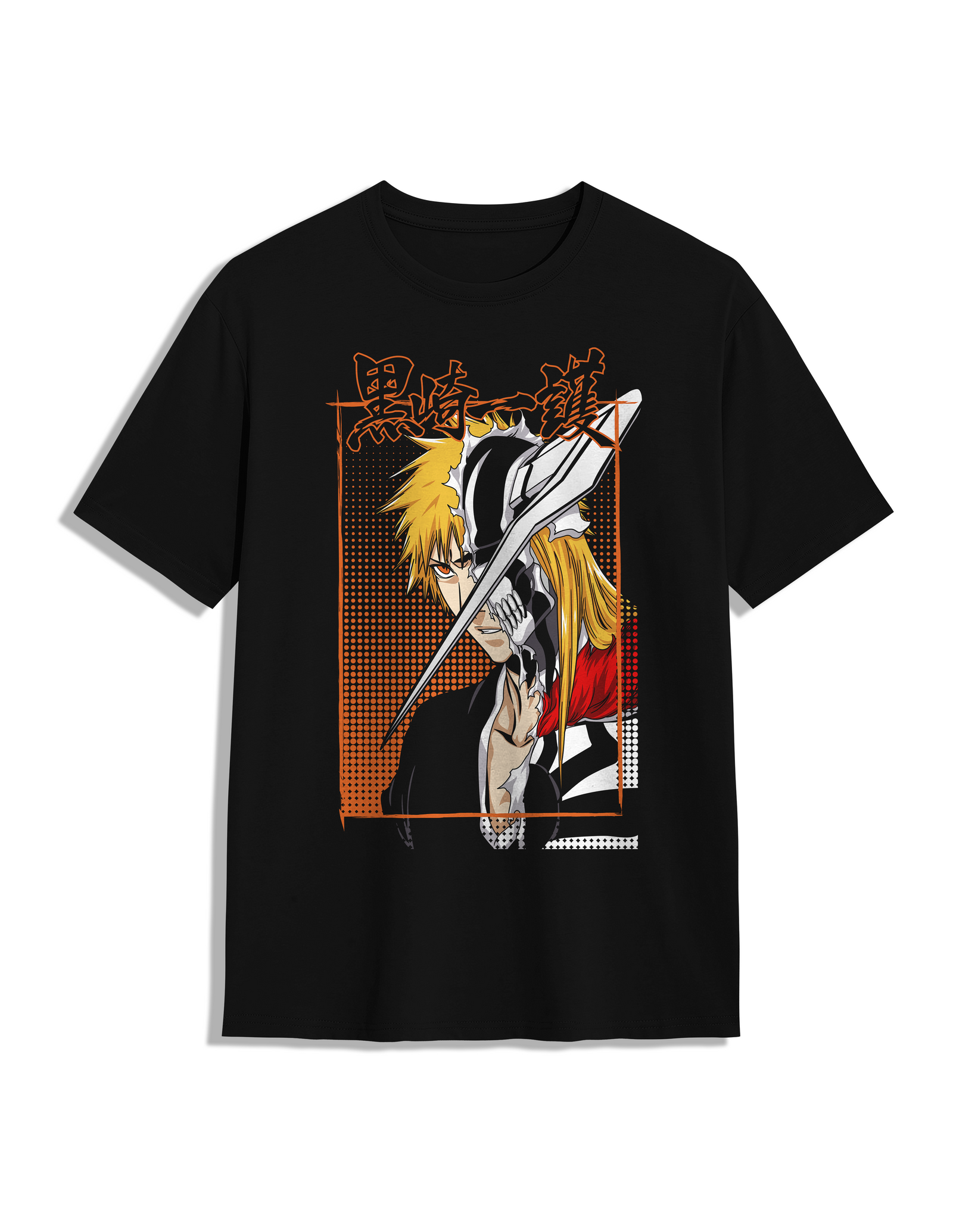 Revive la emoción de Bleach con nuestra camiseta oficial de Ichigo Kurosaki. Esta prenda presenta un estampado frontal de alta calidad inspirado en el protagonista de la serie, capturando su icónico Bankai en tonos naranjas y negros sobre un fondo blanco puro. La ilustración se ubica estratégicamente en el centro del pecho para un impacto visual inmediato, tal como se aprecia en la galería del producto.
