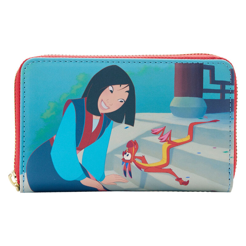 La cartera se cierra con cremallera, tiene herrajes metálicos brillantes de color dorado y presenta detalles estampados.