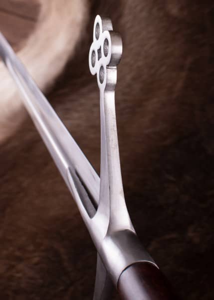 La Claymore escocesa que te presentamos es una réplica exacta de los originales conservados del siglo 16. Se trata de una espada a dos manos con una hoja completa ancha, larga y uniformemente cónica, forjada en acero de resorte EN45. La perilla de cebolla está hecha de acero y el mango de madera teñida y pulida. Además, cuenta con una barra protectora de acero de 29 cm de largo con un diseño único que incluye espuelas que corren en el medio del hueco y brazos inclinados hacia la hoja que terminan en decoraciones de cuatro pasadas.