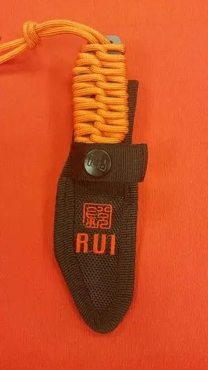 Marca: RUI Mango: Encordado Hoja: Acero Inox (Bao de titanio) Tamaño hoja: 7 cm Tamaño total: 15 cm Funda de nylon