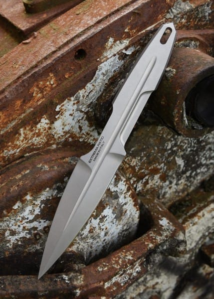 La hoja del cuchillo está diseñada con un falso doble filo que lo hace muy efectivo en empuje y perforación. Es una hoja larga y delgada que fluye desde la hoja hacia el mango, hecho de acero Böhler N690 al igual que la hoja. La hoja se muele integral al cuchillo, creando dos pequeños protectores y un cómodo descanso para el pulgar para evitar que la mano se deslice hacia la hoja.