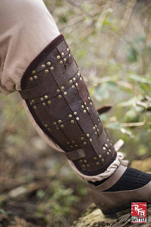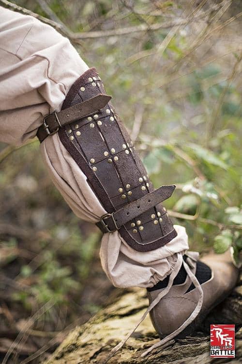Protector de tibia de combate para recreaciones históricas. Disponible en color marrón y talla S. Hecho de piel natural de primera calidad. Costura en los bordes para reforzar la estabilidad estructural y aumentar la vida útil. Los colores están teñidos en el material directamente. Hecho a mano por profesionales cualificados.