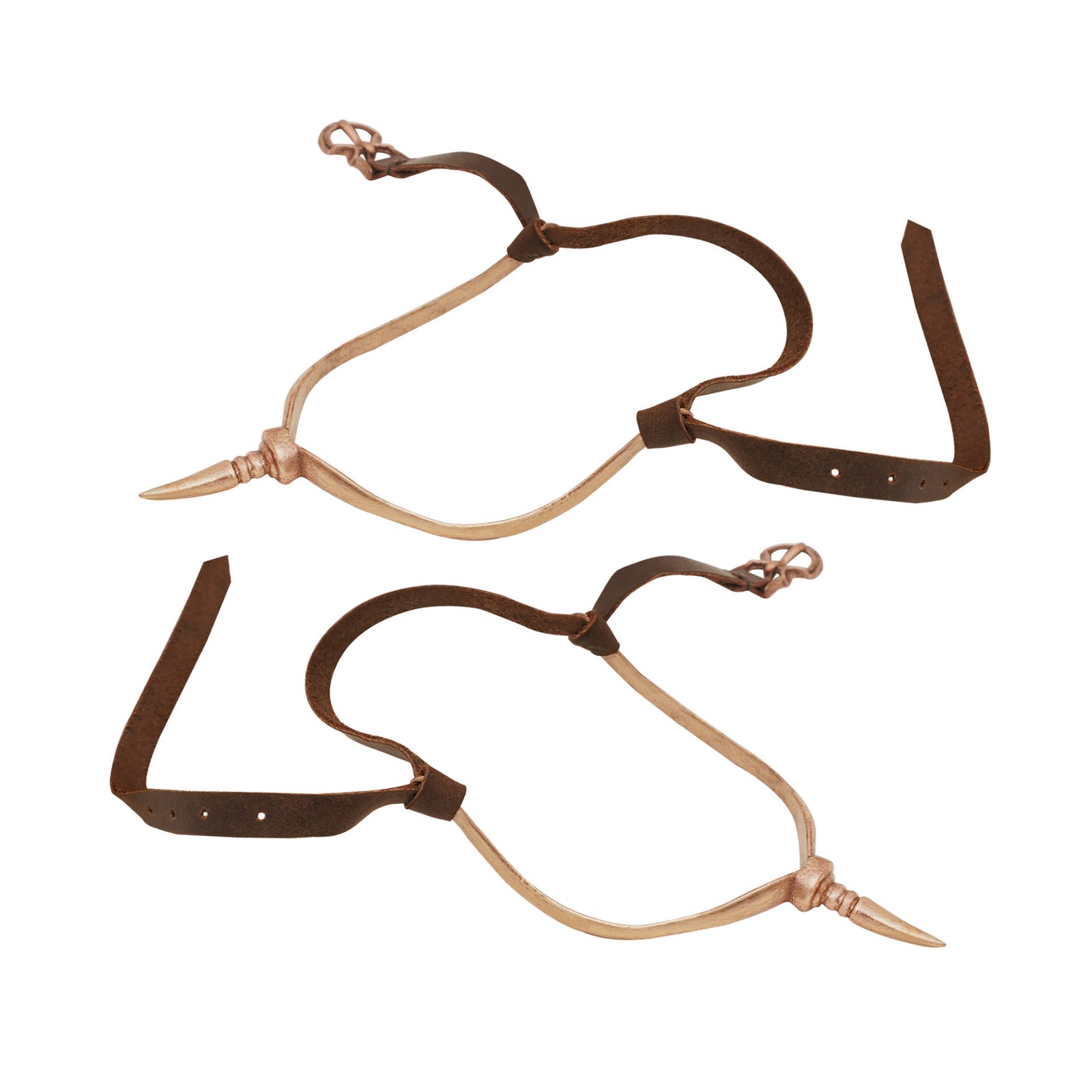 que envuelve el talón y un aguijón torneado que sobresale del cuello, diseñado para ser eficaz sin dañar a la montura. Las trabillas integradas en los extremos están enhebradas con correas de cuero auténtico, incluidas para su uso inmediato.