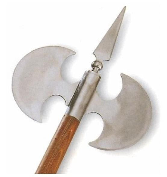 Espectacular réplica de hacha de combate rústico de doble pala lisa, longitud 61 cms, peso 1. 050 kilos. Está fabricada en Toledo, por lo que es de primera calidad