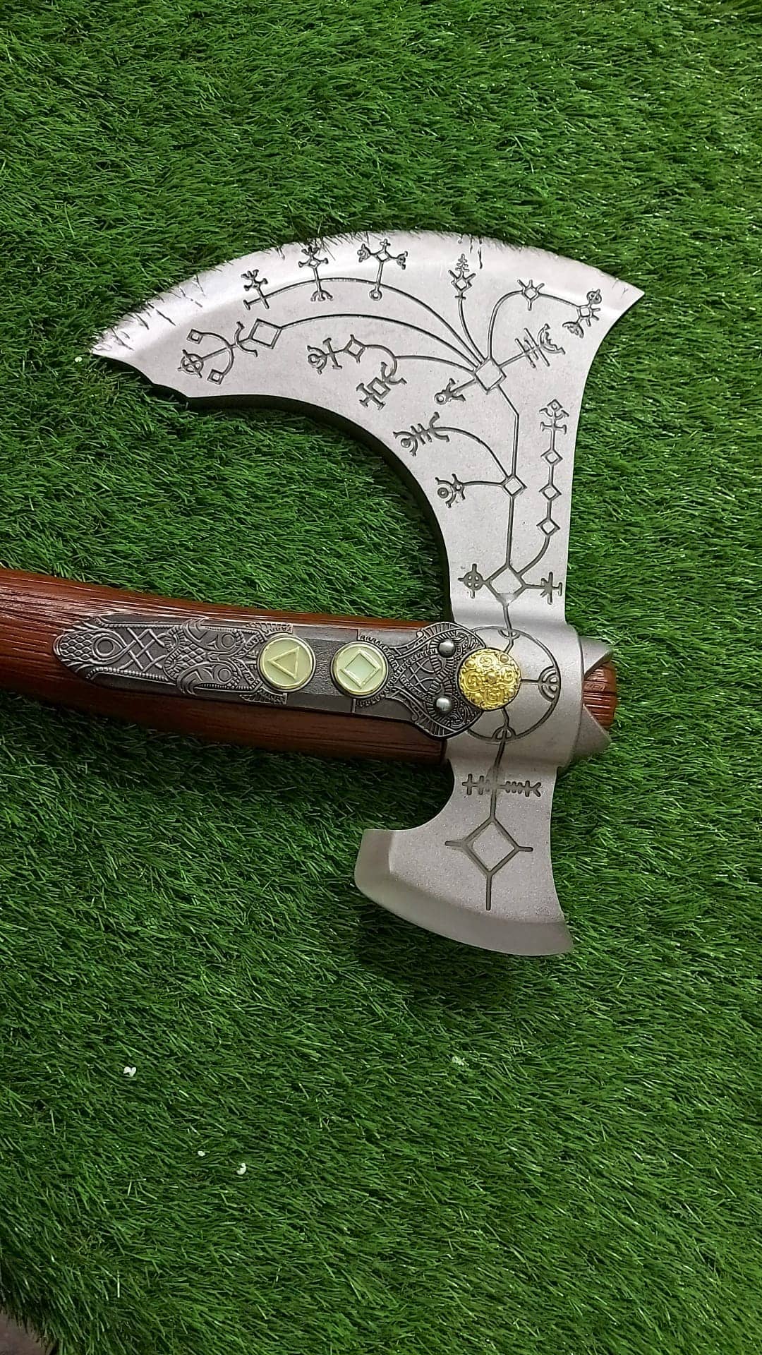 Diseño fiel al original: Grabados rúnicos y acabados intrincados que replican el hacha de Kratos.