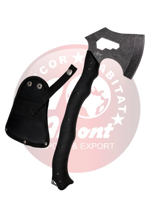 Hacha Third S4100-2 de acero 420 acabado piedra limpia de 37 cm total, mango de ABS negro. Con funda de nylon.