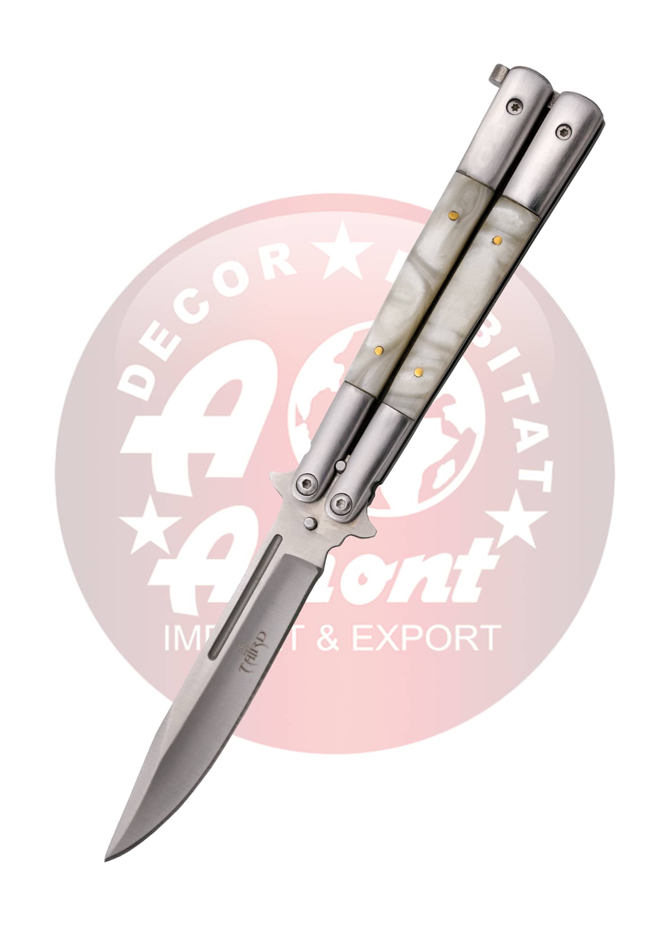 Espectacular navaja abanico o mariposa de la marca third. Es de acero inoxidable de gran calidad con empuñadura también de acero inoxidable y nacarina.