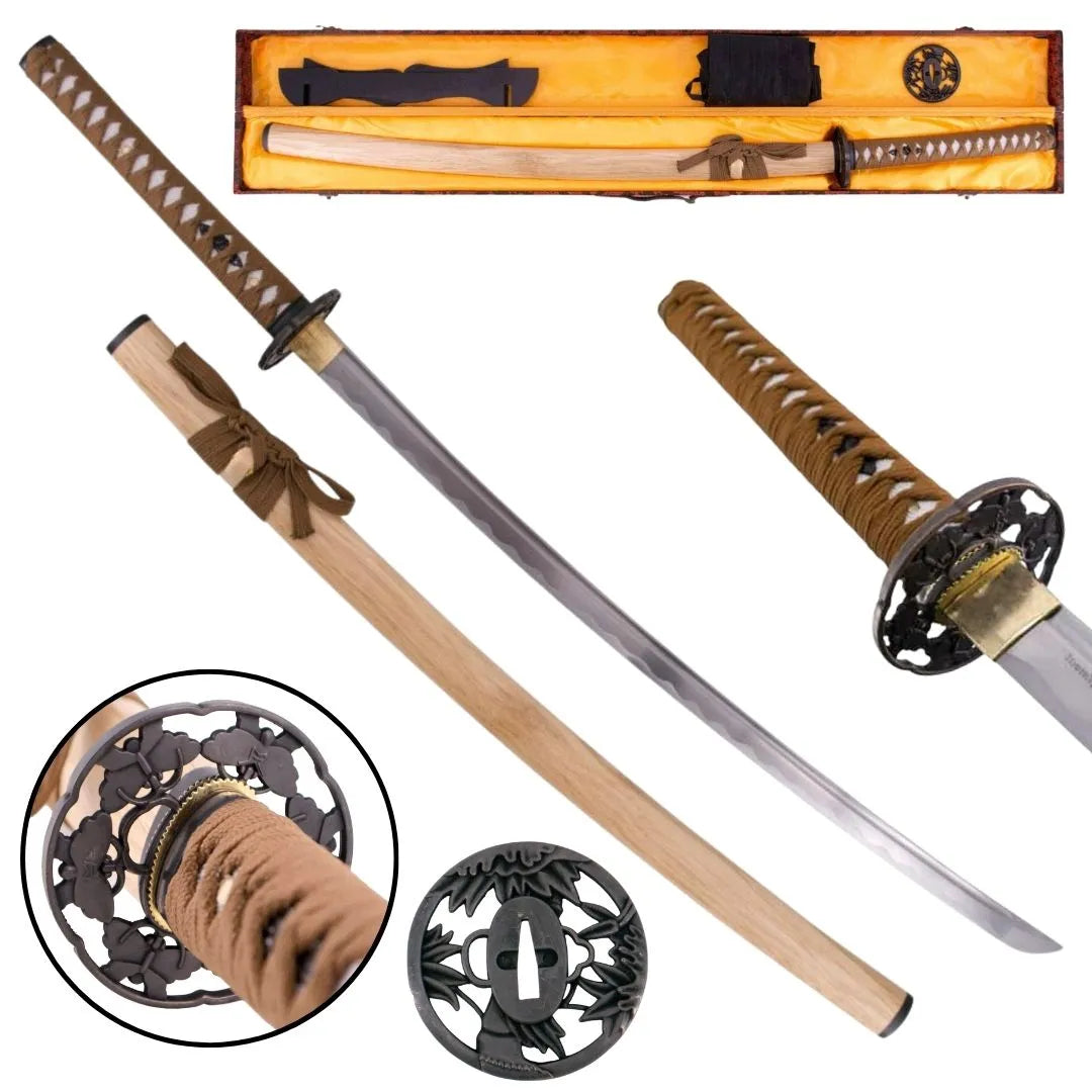 Esta katana cuenta con un filo marcado, ideal para entrenamientos de marcaje y ejercicios de precisión. Su vaina de madera negra lacada combina ligereza y resistencia, permitiendo transportarla cómodamente. Incluye además una tsuba de recambio, para que personalices tu katana según tu propio estilo. Presentada en una elegante caja, también es un regalo excepcional para practicantes y coleccionistas.