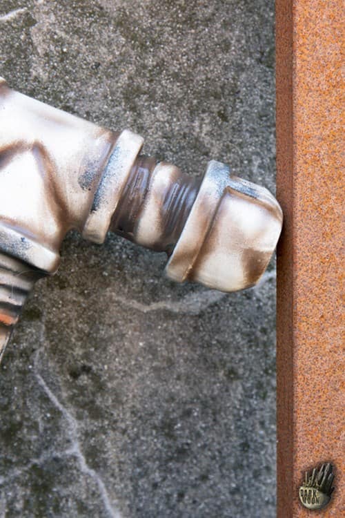 El Steel Pipe Hammer de Dark Moon es un tubo de látex y espuma de 65 cm, con la forma de un arma contundente improvisada. Este producto está pintado a mano y está intrincadamente esculpido para que parezca acero con un acabado desgastado y oxidado. Los finos adornos de la banda de rodadura combinados con una conexión en T y tapas en los extremos le dan a la pipa su forma de martillo, con una cabeza de 23 cm de largo, perfecta para disparos a la cabeza de muertos vivientes. Cómoda piel de ante proporciona un agarre seguro, envuelto alrededor de la parte inferior de 15 cm de largo.