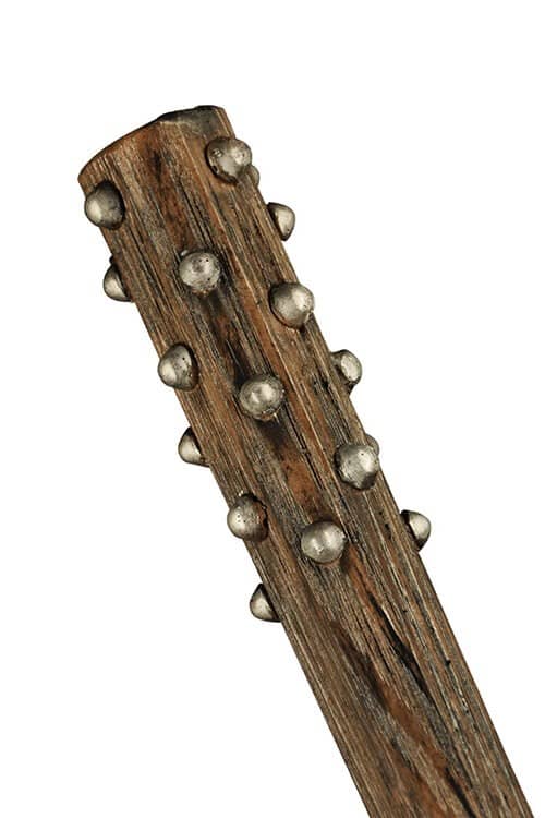Calimacil ha creado el Dentista, un garrote tachonado realista que encaja bien con su línea de productos postapocalípticos y atrae a los LARPers que buscan una alternativa a la espada. El palo de una libra bien equilibrado, de 32" de largo, es seguro y no causó ninguna lesión durante el desarrollo. Su apariencia "natural" lo convierte en un arma adecuada para personajes de Fantasía heroica, como bárbaros, bandidos de caminos, guardias de la ciudad, y sacerdotes que no quieren matar a sus víctimas Peso (g): 435 Longitud total (cm): 81,28 Longitud de la empuñadura (cm): Longitud del bastón (cm)