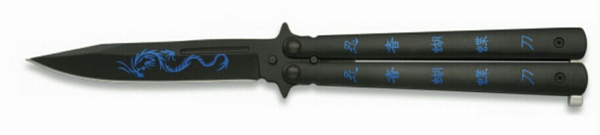 Preciosa navaja mariposa o abanico de acero inoxidable de calidad con letras orientales en las cachas.