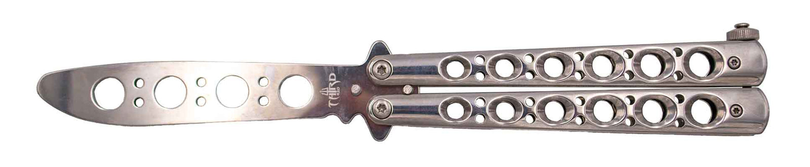 Navaja de abanico de práctica Third K2927B hoja de acero 420 acabado brillo espejo con agujeros de 10,3 cm sin corte, mango de acero 420 acabado brillo espejo con agujeros . Ref. K2927B