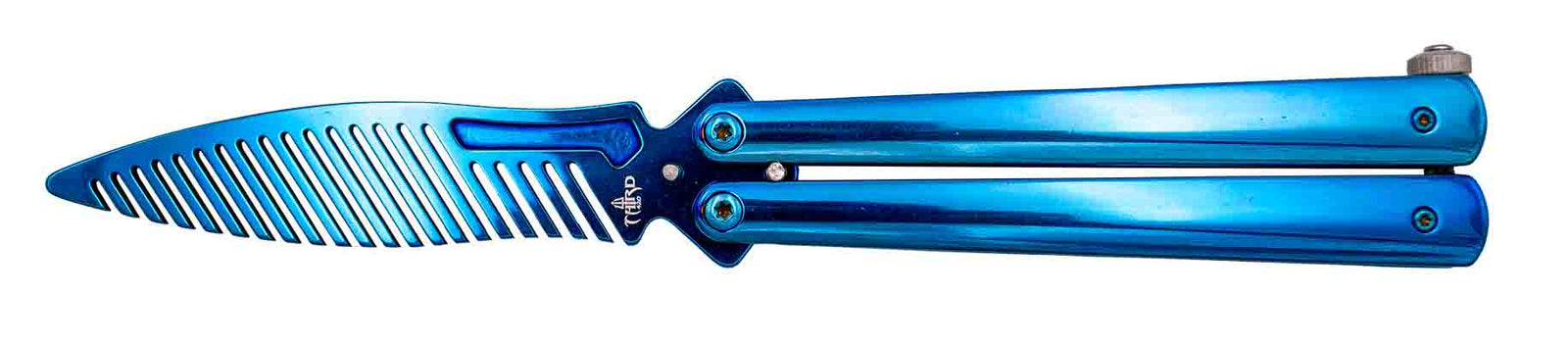 Navaja de abanico Third K2926A hoja de acero 420 estilo peine acabado en titanio azul de 10 cm, mango de acero inox bañado en titanio azul. Ref. K2926A
