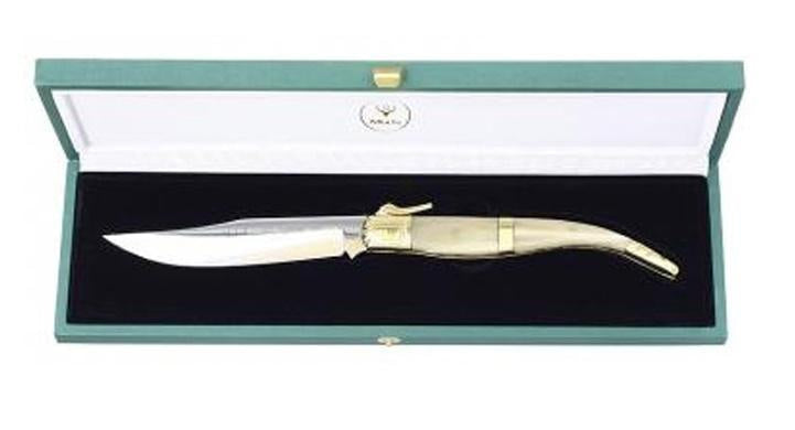 Impresionante navaja de la prestigiosa casa Muela. Es una navaja con hoja de acero molbdeno vanadio de gran calidad y dureza 57-58 HRC, con cachas de asta de ciervo o asta de toro a elegir.