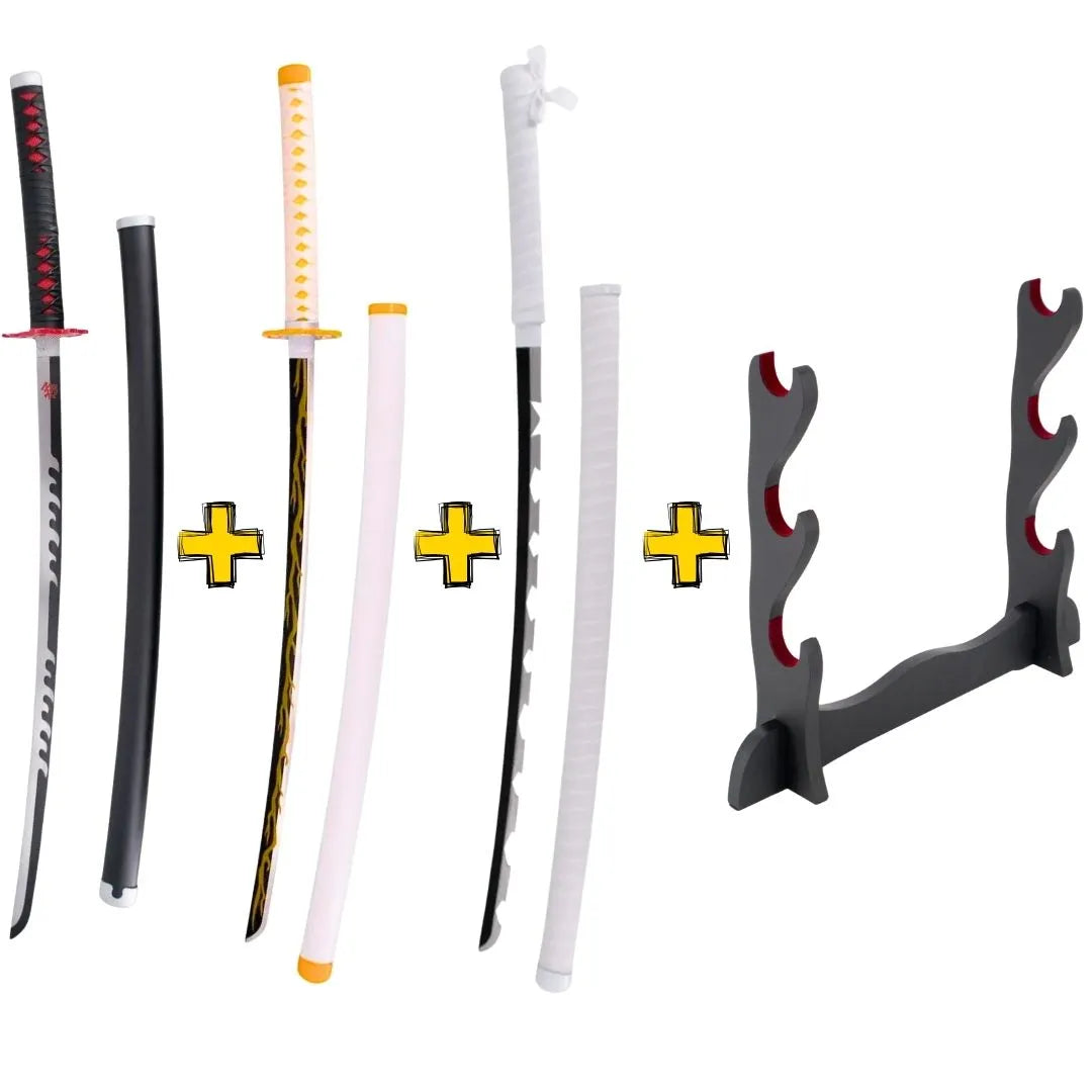 Este set viene acompañado de un katanero (soporte de exhibición), para que muestres con orgullo las tres espadas legendarias. Puedes elegir entre un modelo básico en madera negra o un expositor personalizado con motivos de Kimetsu no Yaiba, ideal para quienes desean rendir homenaje visual completo a la saga.