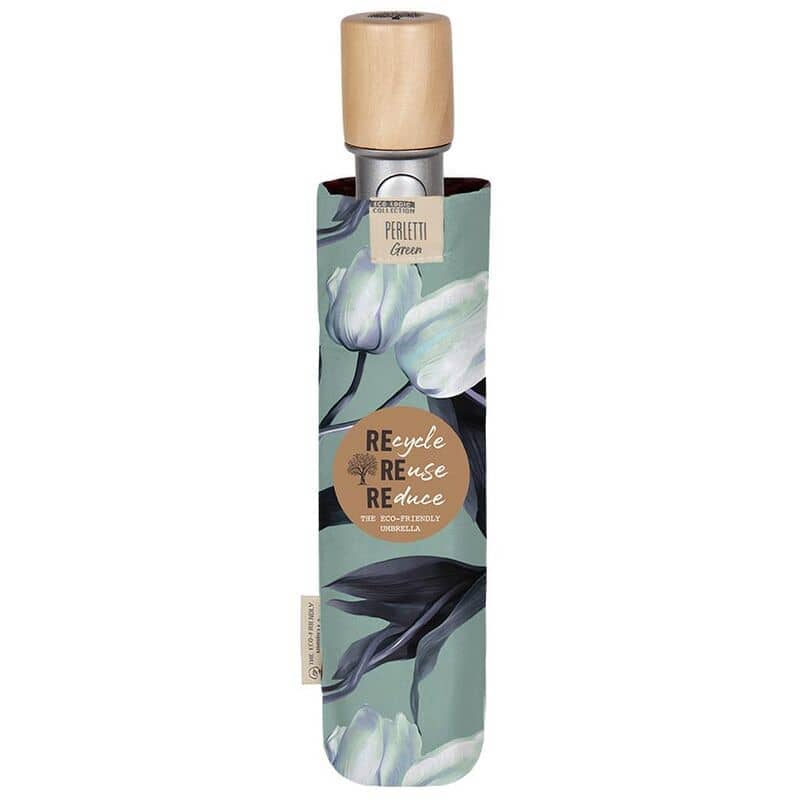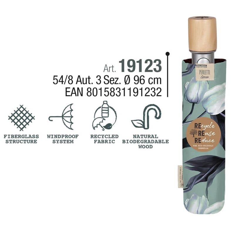 Tamaño diámetro: 96 cm. Material reciclado. Automático. Varillas fibra de vidrio. Antiviento. Puño madera natural.