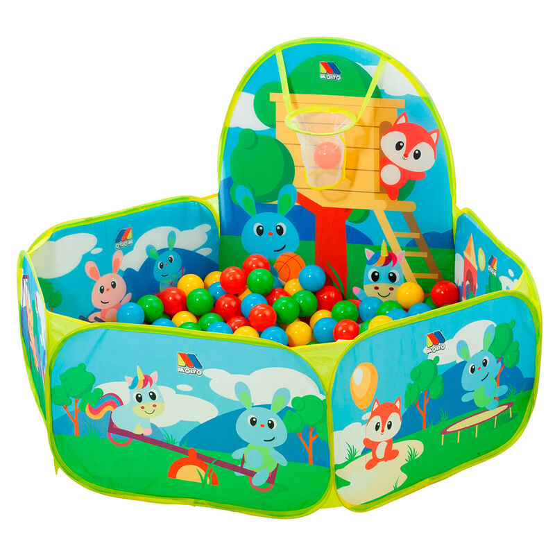Parque de bolas infantil con canasta.