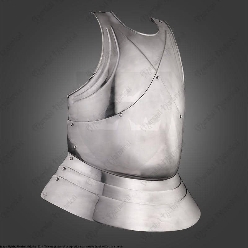 Nuestro peto de infantería milanesa está hecho de acero de calibre 16, lo que lo hace ideal para la recreación. Está reforzado con un plackart y cuenta con correas de cuero ajustables para un ajuste seguro.