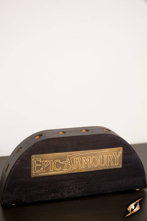 Hecho a mano con madera auténtica, cada soporte para varitas presenta su propio grano y color únicos y está lijado hasta lograr un acabado suave. El frente del bloque está decorado con una placa de latón grabada con el logotipo de Epic Armory.