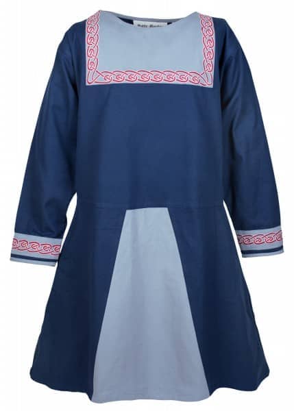 Nuestra túnica de algodón está hecha de lienzo macizo y decorada con un borde bordado. El borde representa un patrón de nudo (también llamado nudo celta) y se basa en el borde de la piedra de la imagen de Lärbro (Gotland). La túnica está cortada de ancho y tiene un regazo acampanado. Por lo tanto, debe usarse con un cinturón. El escote es ancho y debajo de los brazos se insertan gussets (piezas rectangulares de tela). Los bolsillos se insertan en la costura lateral. El diseño elaborado y los detalles contrastantes dejan claro que se trata de una prenda superior. La apariencia y el corte de esta túnica corresponden a la