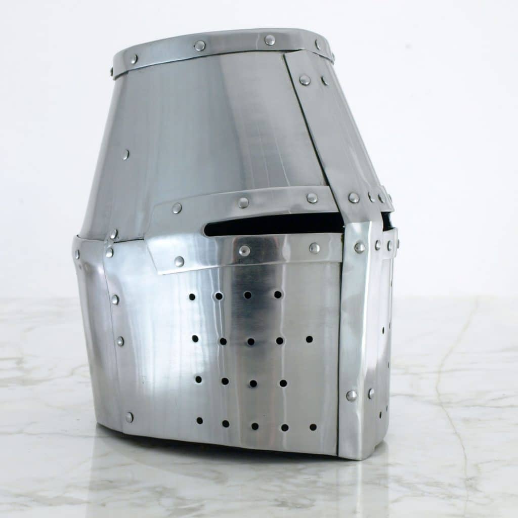 El yelmo, que comenzó a verse en el campo de batalla tan pronto como en el siglo XII en sus formas más tempranas, resultó ser un diseño ganador que se usó casi durante los 3 siglos siguientes. Una pieza sencilla de fabricar y como su alargado uso demuestra, útil para la protección de la caballería. Normalmente llevado sobre el almófar de malla, o sobre un capacete o cervillera, solía hacerse con 4 piezas remachadas entre si y con una calva plana. Solía tener un visor fijo, normalmente con un aspecto feroz que ayudaba a aumentar el ya de por si intimidante aspecto de un caballero a la carga.