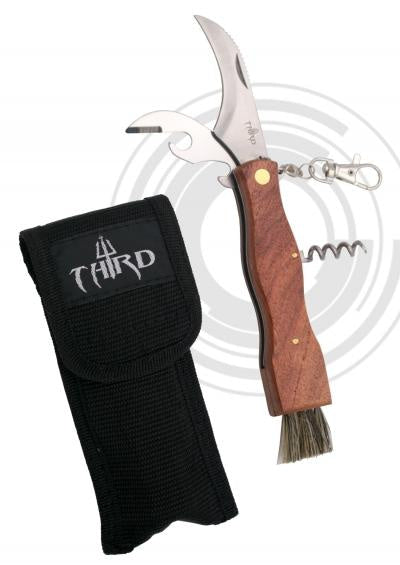 Terceiro canivete K1279 com cabo de madeira, lâmina de aço inoxidável de 7,8 cm, inclui chaveiro, saca-rolhas, abridor de garrafas e pincel. Com bainha de náilon.