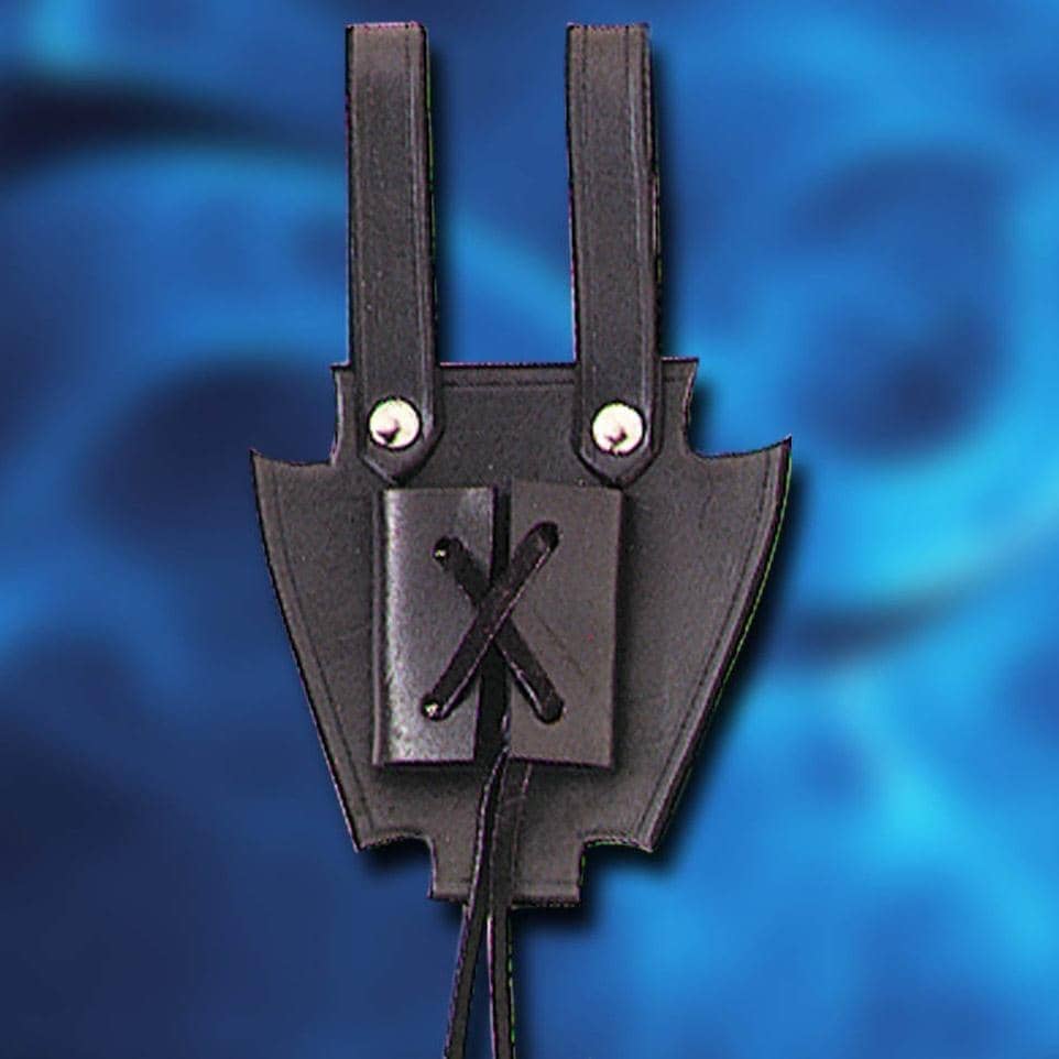 Porta-punhal confeccionado artesanalmente em couro resistente de qualidade superior. Decorado com parafusos de metal niquelados. Um design atraente e muito seguro para sua adaga ou punhal. Projetado para caber na maioria dos cintos.