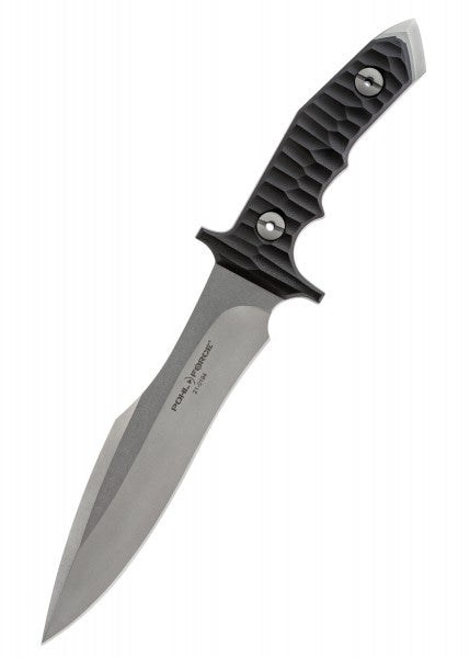 e 6 milímetros de espessura é adequado para uma ampla gama de aplicações. Para alta retenção de aresta e capacidade de carga da lâmina, a escolha recaiu sobre o conhecido aço para ferramentas D2. O acabamento stonewashed cria uma superfície resistente a arranhões e também aumenta a resistência à corrosão da lâmina. O enchimento sólido e continuamente endurecido carrega as escamas do cabo feitas de G-10 preto durável. O design escalonado do cabo conhecido da Pohl Force e a característica superfície tridimensional fresada das escalas do cabo oferecem uma posição de mão excelente e segura. Para trabalhos poderosos ou finos, a abertura pronunciada e também arredondada dos dedos na frente do elemento de proteção permite que a faca avance. Um orifício de bolso na extremidade da alça oferece a opção opcional de montagem de um cordão (incluído).