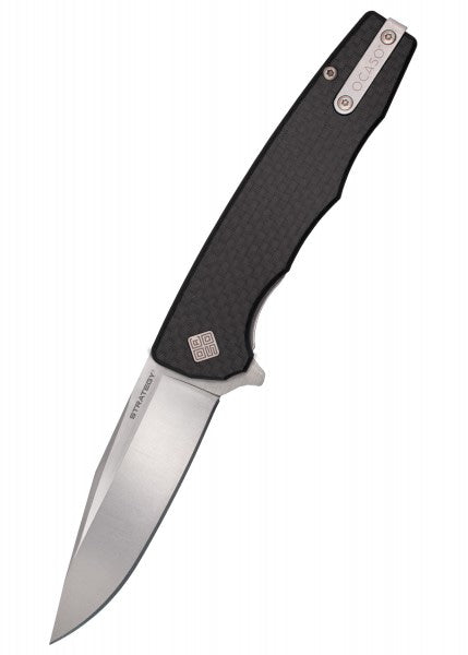 A alça foi projetada ergonomicamente para máximo conforto e funcionalidade e está disponível em escalas fresadas G-10 opcionais de alta resistência, fibra de carbono descascada/G-10 ou alumínio para aeronaves. Apresentando o clipe de transporte profundo dobrável exclusivo da Ocaso e rolamentos em gaiola de aço inoxidável com abertura de aba para uma implantação suave, o Strategy Carbon Fiber/G-10 é o complemento perfeito para qualquer bolso ou bolsa de aventura.