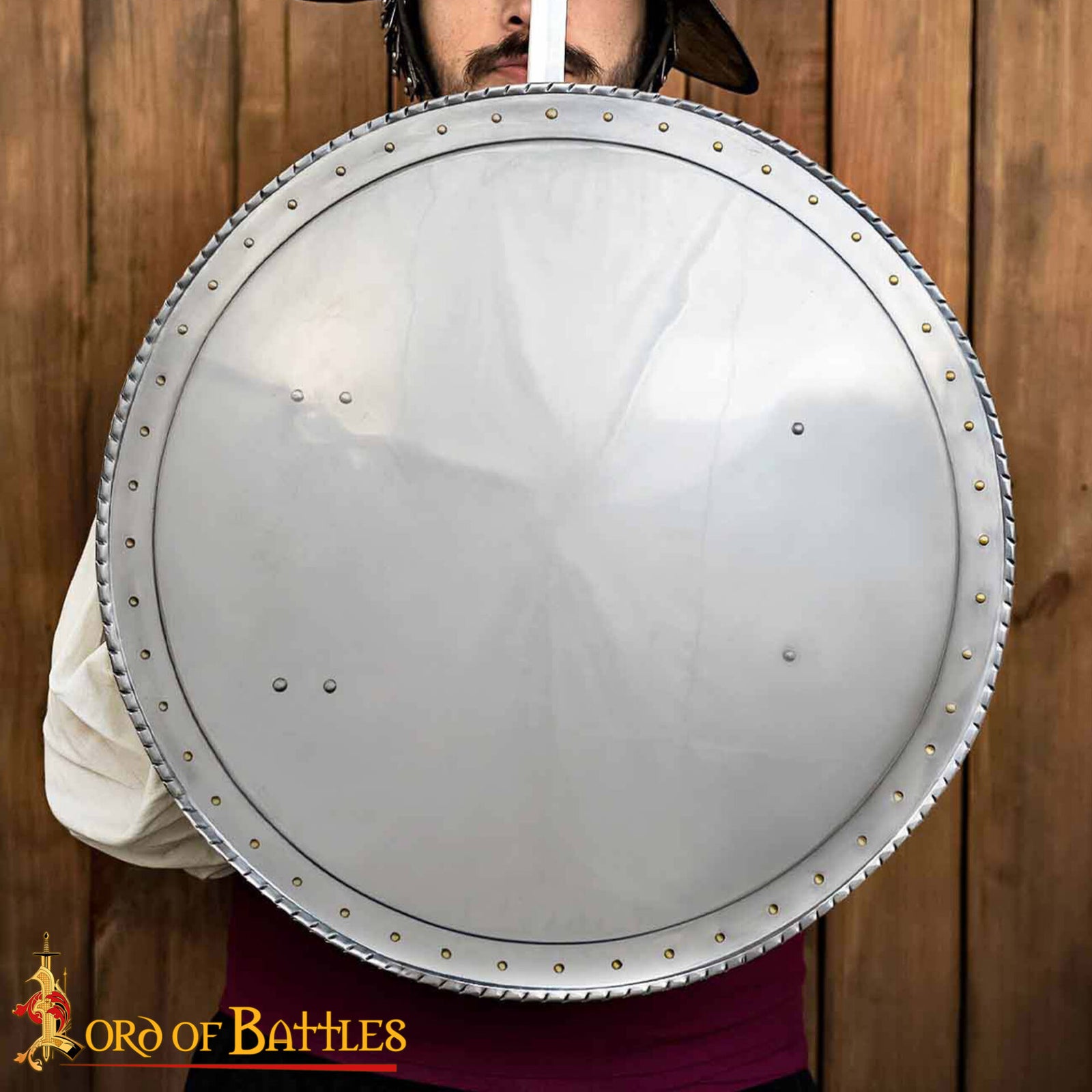 Escudo redondo em aço Rodella, broquel medieval calibre 16 com rebites em latão - Larp, combate de palco e exibição