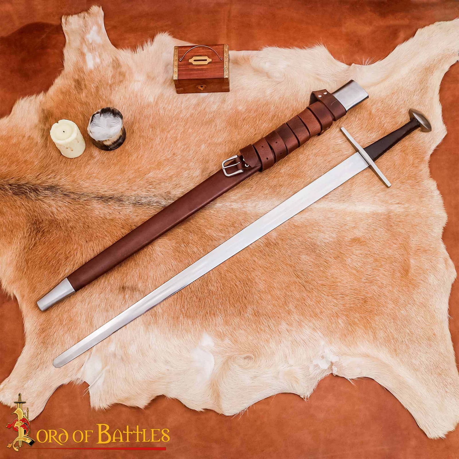 Esta espada vem completa com uma bainha premium, feita com um núcleo de madeira resistente revestido em couro castanho e reforçado com folheado e garganta de aço polido. Várias correias ajustáveis permitem prendê-la confortavelmente a um cinto para transporte ou apresentação.